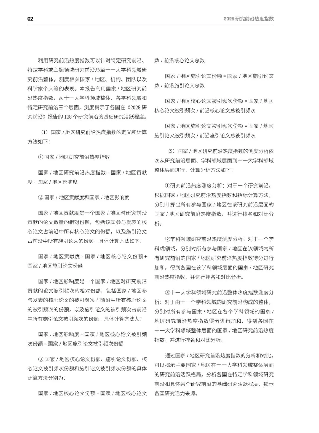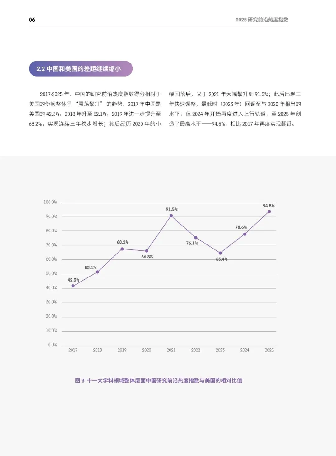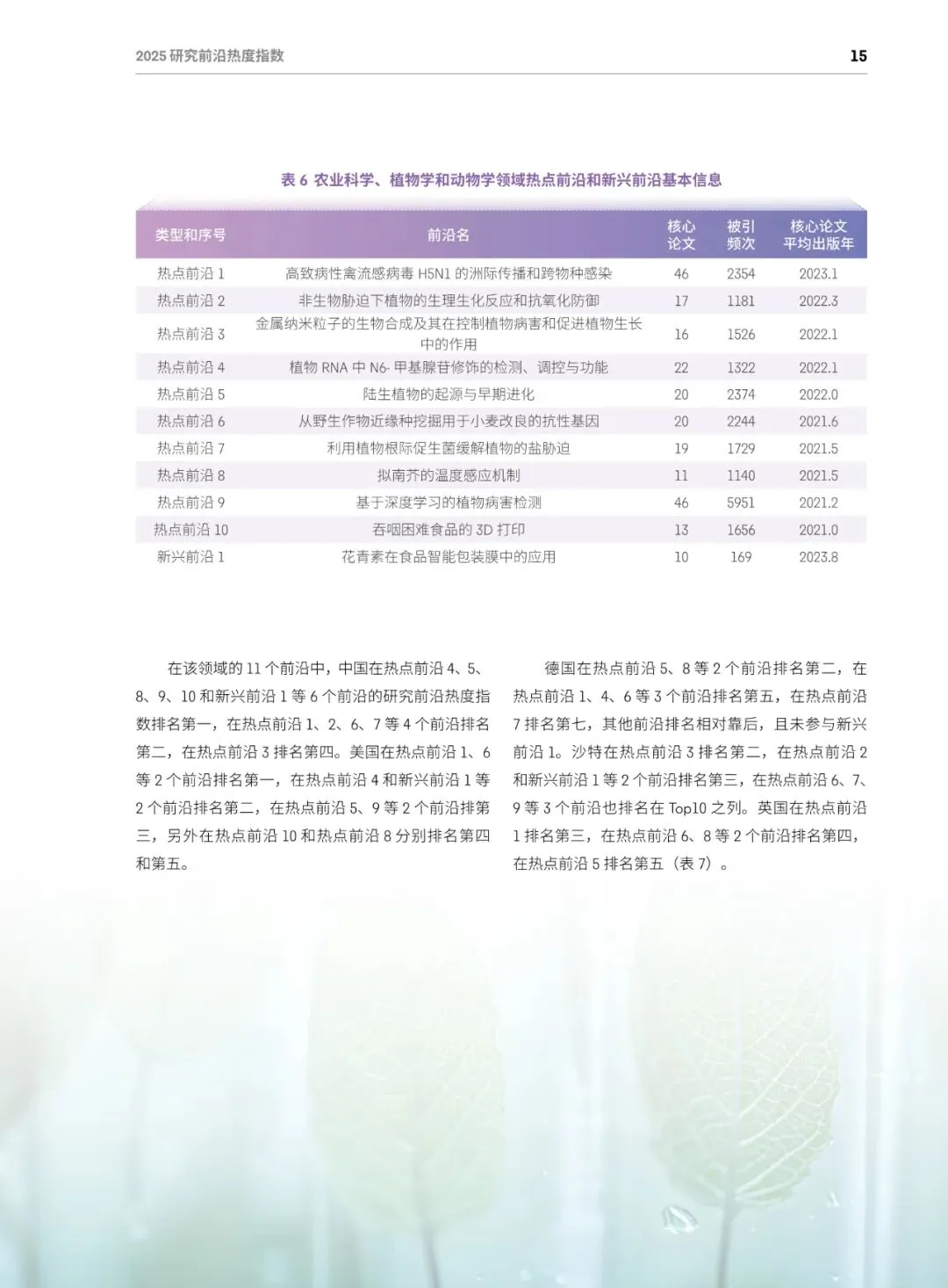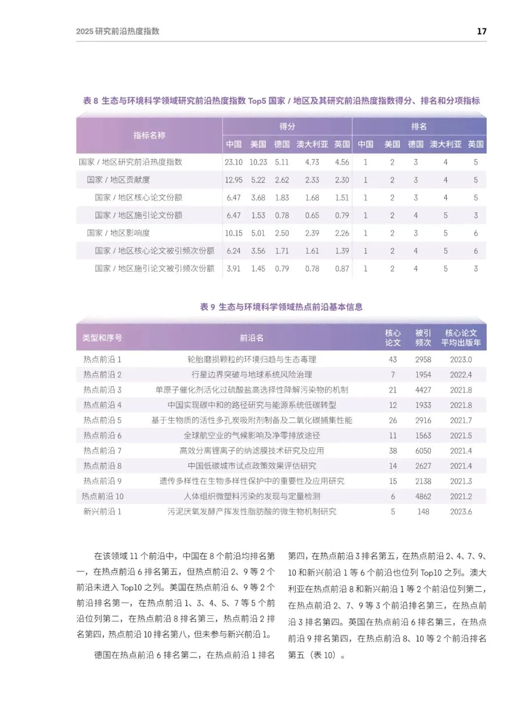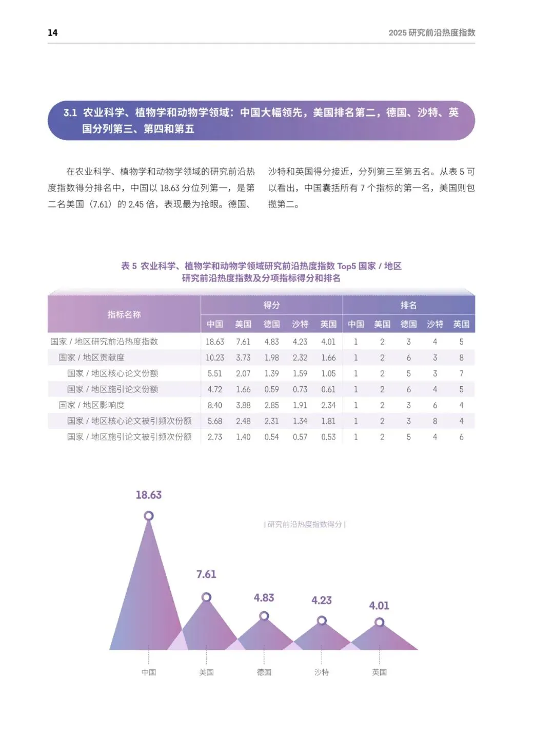 总体格局:美国蝉联综合榜首,在64个前沿(50%)排名第一;中国稳居第二,在52个前沿(40.6%)排名第一;英、德、加分列三至五位,中美两国共同包揽全部11个学科的最高分。