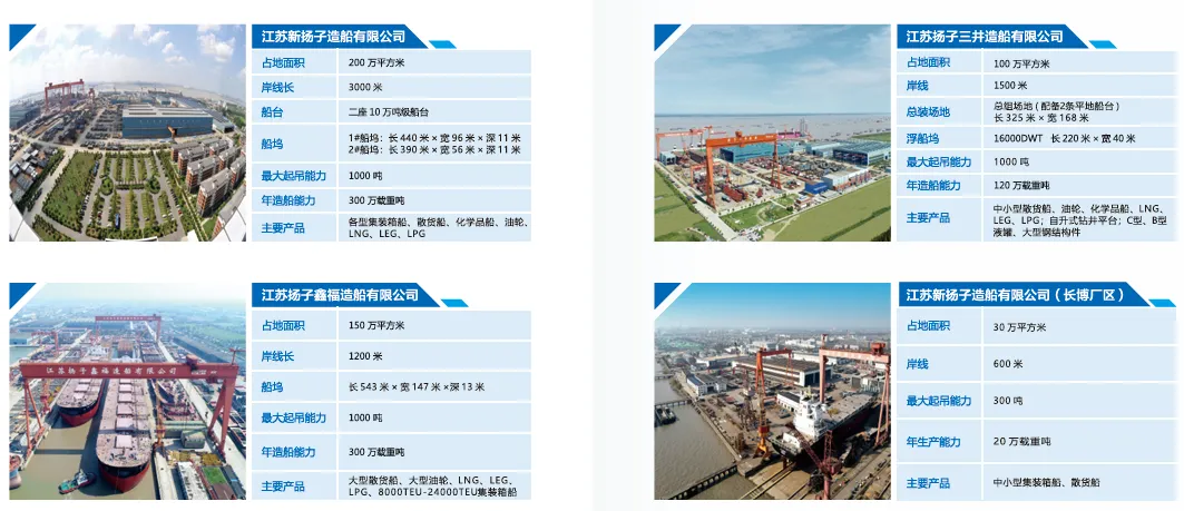 2. 核心造船板块:作为集团核心利润贡献主体,采用“专业化分工、规模化协同”的产能布局模式,下辖4家核心骨干子公司,形成覆盖高中低端船型的完整产能矩阵,各子公司依托差异化特色产品精准匹配全球市场多元化需求,核心产品与定位如下:①江苏新扬子造船有限公司:下设靖江基地与长博厂区两大核心制造阵地,构建高端船型协同制造格局。其中,靖江基地聚焦高技术含量清洁能源船型研发制造,是集团高端清洁能源集装箱船与超大型气体运输船核心建造基地,特色产品体系兼具技术领先性与市场竞争力:一是清洁能源集装箱船系列,包括首制1260TEU甲醇双燃料集装箱船,以及为新加坡太平船务定制的8200TEU薄膜型LNG双燃料集装箱船——该船总长260.0米、型宽45.6米、型深24.7米,最大装箱量8350TEU,搭载GTT MARK Ⅲ薄膜型围护系统,适配氨燃料装载并获氨-Ready船级符号,配备iCER系统降低甲烷逃逸,可实现20%碳排放、85%氮氧化物排放及99%硫氧化物排放削减,提前满足EEDI phase3要求,兼顾支线与远洋航线运营需求;二是超大型乙烷运输船(VLEC),其建造的全球最大99000立方米VLEC,凭借超大舱容与高效运输效率,成为国际乙烷运输市场的标杆产品。长博厂区坐落于靖江市江阴—靖江工业园区,定位为高端散货船与清洁能源船协同制造基地。江苏新扬子造船有限公司占地面积超200万平方米,拥有3000米长江深水岸线及2400米舾装码头,配备2座10万吨级干船坞(1#船坞:长440米×宽96米×深11米、2#船坞:长390米×宽56米×深11米),搭载900T、800T、600T等大型造船起重设备,具备超大型船舶整体建造与分段吊装核心能力。特色产品以大型散货船为主,涵盖好望角型散货船、卡姆萨型散货船等主流船型,同时承接部分8200TEU以下LNG双燃料集装箱船的分段制造与总装任务,年造船产能超200万载重吨,现有员工4300余人,与靖江基地形成产能互补,共同保障高端船型订单高效交付。②江苏扬子鑫福造船有限公司(泰兴基地):专注大型LNG船与超大型散货船等重型船型建造,特色产品以高吨位、高可靠性、高经济性为核心优势。核心产品包括17.5万方大型LNG船——该船为全球主流大型LNG运输船型,具备大容量燃料存储与高效气化输出系统,适配全球主要LNG运输航线,目前2艘船在建;同时精通超大型散货船建造,船型涵盖好望角型散货船、卡姆萨型散货船等,具备载重量大、油耗低、航行稳定性强等特点,广泛服务于全球矿产、粮食等大宗商品运输领域,具备超大型船舶建造核心技术实力。③江苏扬子三井造船有限公司(太仓基地):由集团与三井造船合资设立的高端气体船专业制造基地,专注LNG/LEG/LPG等液化气船及高端液货船建造,特色产品精准聚焦中型高端气体运输船细分市场。核心产品包括36000立方米LEG(液化乙烯气)运输船、40000立方米LPG(液化石油气)/液氨运输船,同时涵盖MR型油轮与新设计卡姆萨型散货船,年造船产能达15-18艘、约150万载重吨,现有12艘中型液化气船在建。产品凭借精湛制造工艺与可靠性能,深度服务全球高端船东群体,是集团高端气体船制造领域的重要支撑力量。④江苏天晨船舶进出口有限公司:作为集团船舶进出口业务统筹平台,虽不直接参与船舶制造,但核心服务围绕集团各子公司特色产品展开,为海外客户提供从订单对接、合同履约到售后保障的全链条一体化服务。重点对接新扬子的高端清洁能源船、扬子鑫福的大型LNG船与散货船、扬子三井的液化气船等特色产品出口业务,精准衔接全球船东需求与集团产能输出,保障特色产品顺利进入国际市场,是核心造船板块链接全球市场的关键枢纽。各子公司依托长江黄金水道岸线资源,通过集团统一的供应链管理与生产调度体系,实现特色产品产能互补与运营效率最大化。