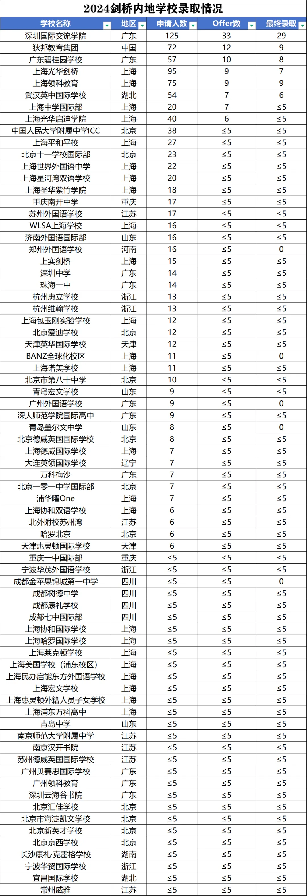 这些学校主要集中于上海(23所)、北京(10所)、广东(7所,包含深圳)、江苏(5所)等地。详细录取来源学校名单如下: