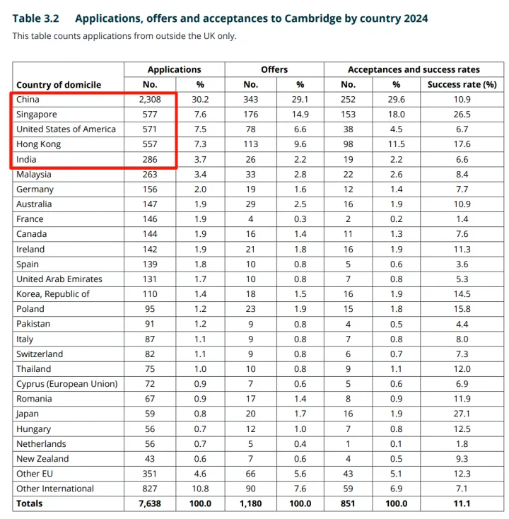 在剑桥大学的国际学生申请中,中国持续占据首位,成为申请人数和录取人数最多的生源地。除中国大陆外,申请数量较多的国家和地区依次为新加坡、美国、中国香港以及印度。