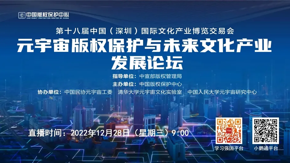12月28日,由中宣部版权管理局指导、中国版权保护中心主办的“元宇宙版权保护与未来文化产业发展论坛”以线上方式成功举办,并通过“学习强国”学习平台进行了公益直播。本次论坛是第十八届中国(深圳)国际文化产业博览交易会(简称“文博会”)的重要活动之一。中宣部版权管理局局长王志成在致辞中表示,版权关系发展先进文化生产力,关系保护民族文化创造力,关系提升国家文化软实力。版权制度在传承优秀文化、促进文化繁荣发展、建设社会主义文化强国进程中具有重要作用。论坛上,来自清华大学、华东政法大学、中国人民大学、中国社会科学院、北京大学的专家学者以及中国版权保护中心主要负责同志等6人作主旨发言。中国版权保护中心党委委员、副主任张有立主持论坛。