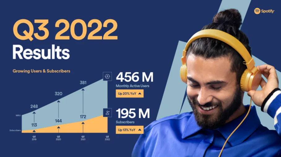 10月25日,Spotify发布2022年第三季度财报。在Q3,Spotify的月度活跃用户总数增长至4.56亿,环比增长2300万,是公司历史上最大的第三季度净增加量。不包括从俄罗斯的退出,公司年初至今的净增加量也创历史新高,预计将持续到年底。其中,付费用户达1.95亿,环比增长700万,比预期高出100万。Spotify指出,其第三季度MAU增长的部分原因是由于多媒体营销活动推动了激活和重新激活,印度市场的增长好于预期。与此同时,该公司的付费订阅增长,部分归因于以拉丁美洲为首的所有地区的出色表现,以及所有地区的第三季度促销活动结果都好于预期。