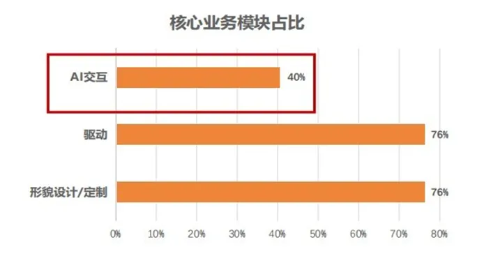 虚拟数字人企业的业务模块主要集中于形貌设计/定制、驱动,也即实现虚拟数字人拟人化的“样貌”、“表情”和“动作”,仍停留在单向传播的层面,AI交互功能仅占比40%。单向传播无法充分调动受众的参与感,具有智能语音交互功能的虚拟人IP能够担当虚拟助手或者陪玩的角色。例如,腾讯打造出王者荣耀智能机器人“妲己”,使IP实现“深定制、长陪伴多场景”的解决方案。但虚拟数字人智能交互的实现涵盖知识库、自然语言处理等技术模块,对于技术研发和资金基础较薄弱的公司而言有一定的门槛。