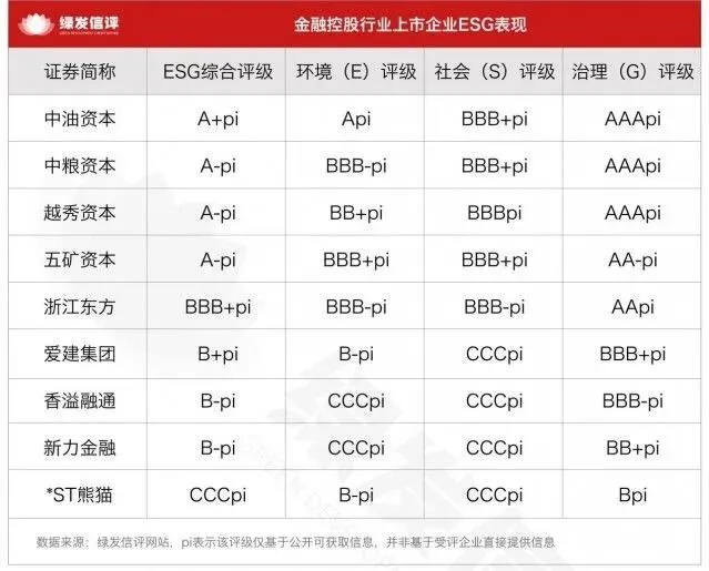 绿发信评主动评级结果显示,金融控股行业整体ESG评级缺少AA-pi以上级别企业,级别主要分布在A+到BBB+pi区间和B+pi到CCCpi区间,呈现明显的两极分化。其中,中油资本获A+pi评级;中粮资本、越秀资本和五矿资本获A-pi评级;浙江东方获BBB+pi评级;爱建集团、香溢融通、新力金融和*ST熊猫四家企业因ESG相关信息披露不足处于B+pi至CCCpi区间。