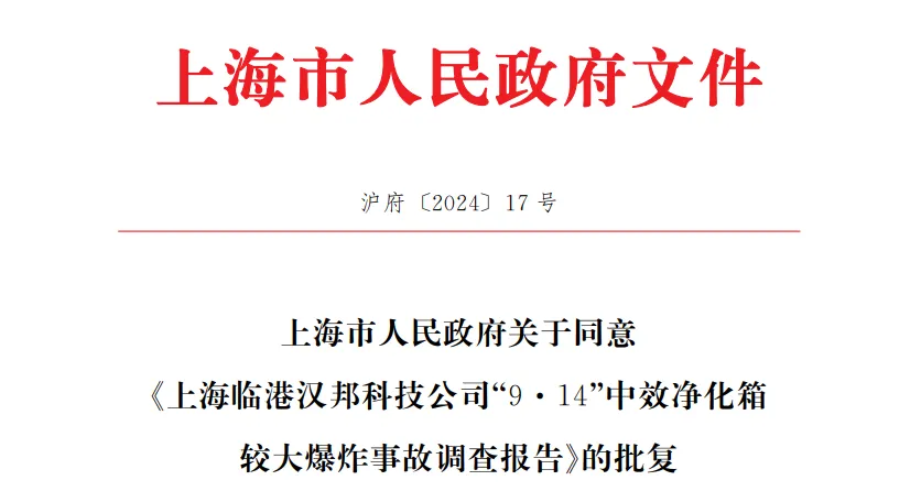 经调查认定,上海临港汉邦科技公司“9·14”中效净化箱较大爆炸事故是一起因作业人员违反操作规程,企业风险辨识存在漏洞,安全管控措施落实不到位而导致的生产安全责任事故。