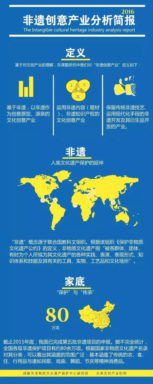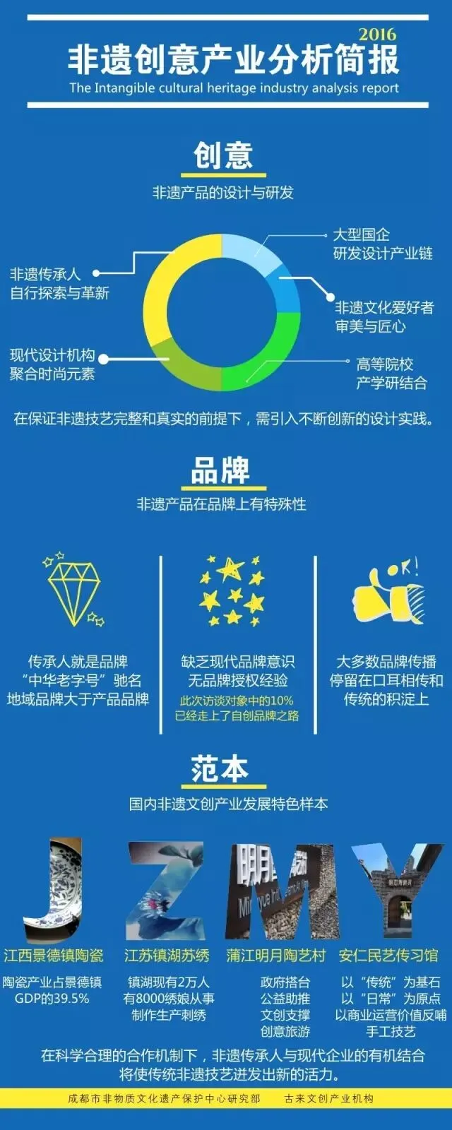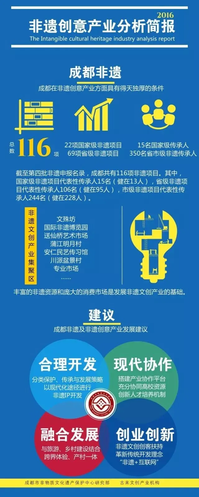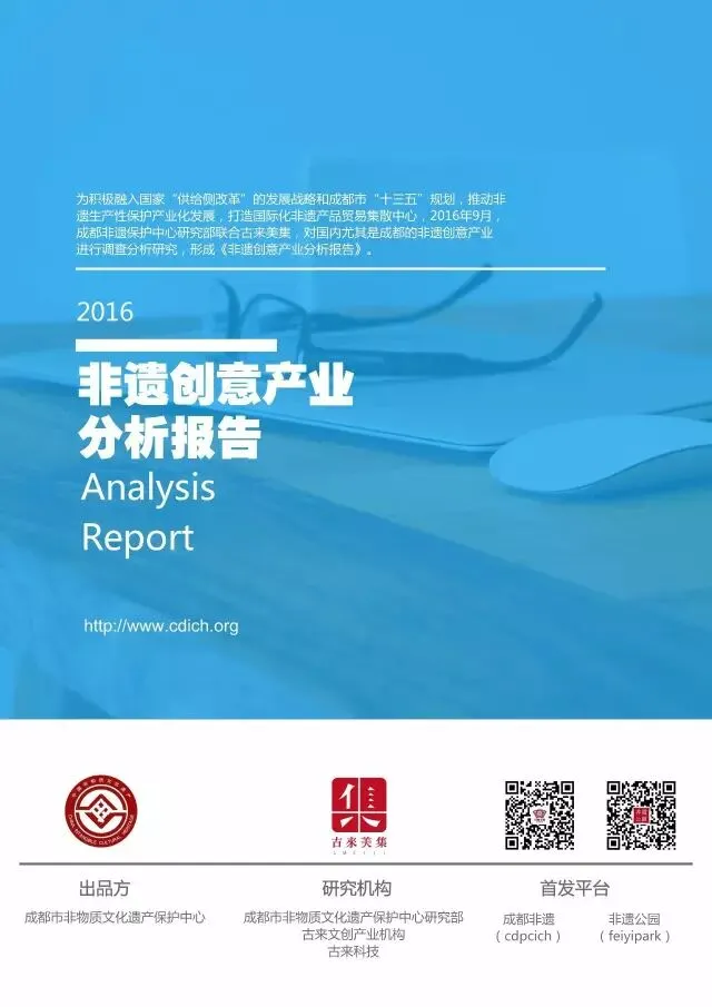 2016年9月,成都非物质文化遗产保护中心 联合 成都古来文创产业机构,对国内尤其是成都的非遗创意产业进行调查分析研究,形成了《非遗创意产业分析报告》。这将有可能成为国内首部针对非遗文化创意产业研究分析的专业化报告。