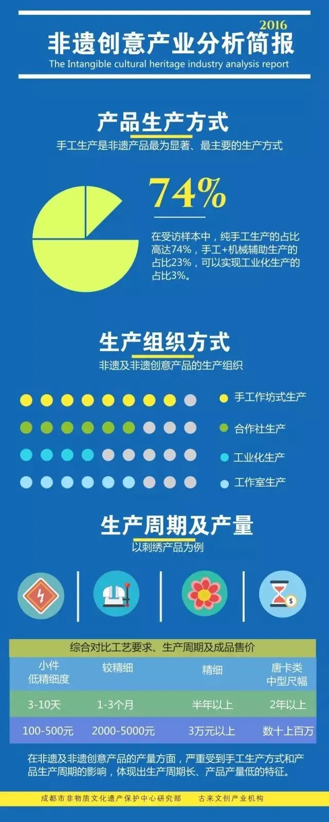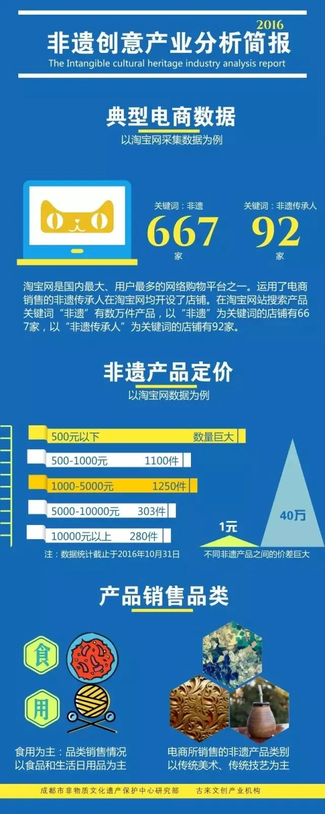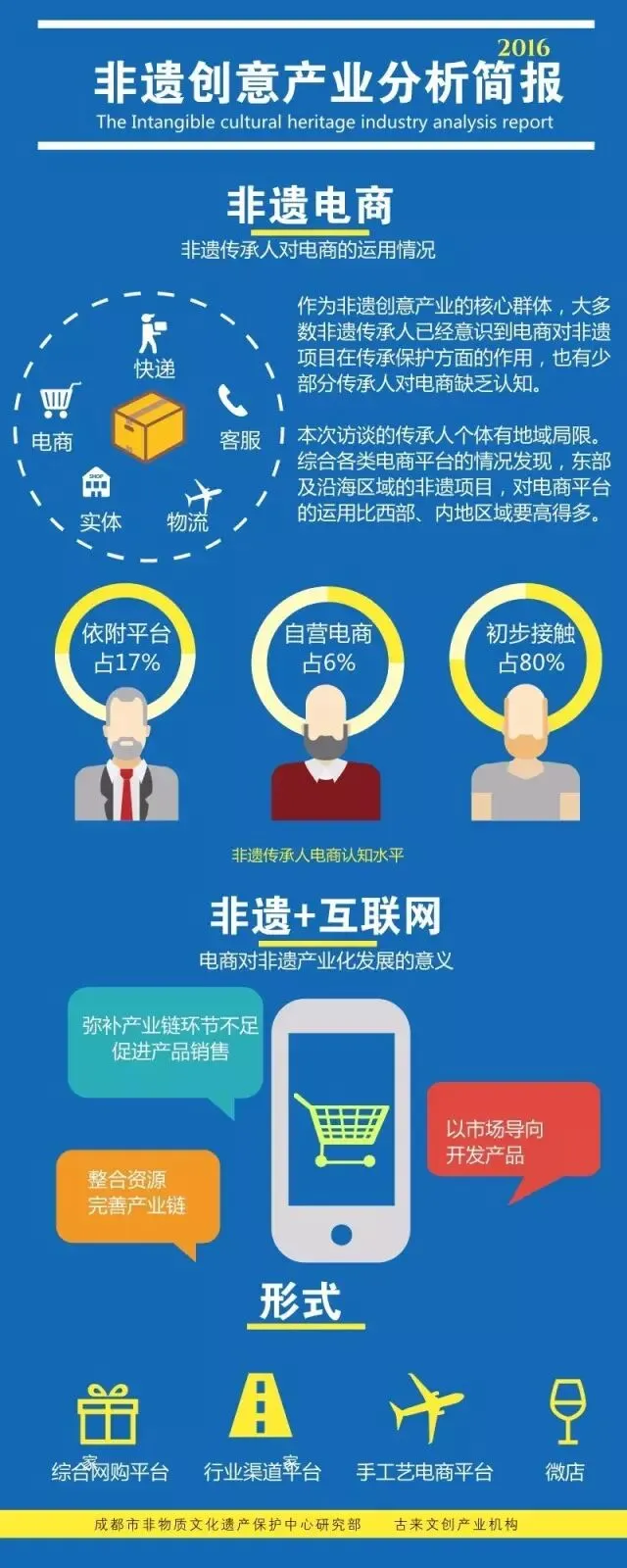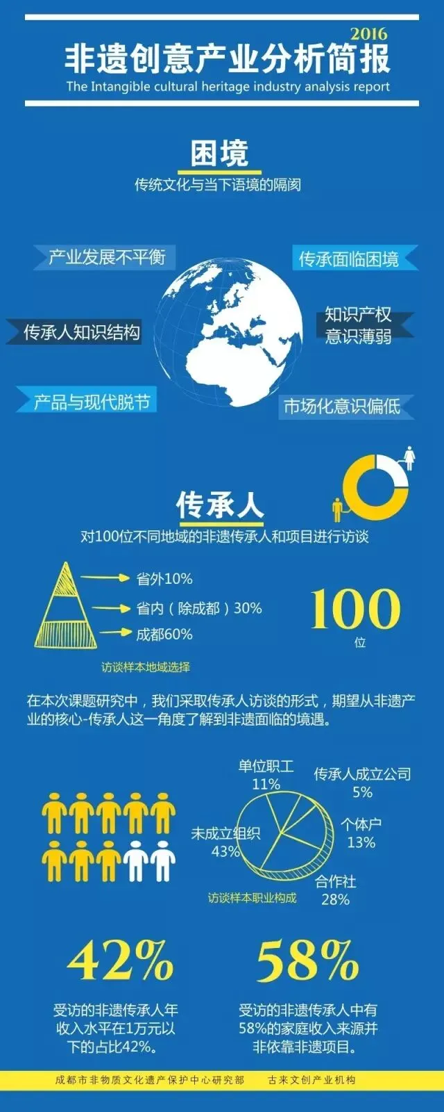 2016年9月,成都非物质文化遗产保护中心 联合 成都古来文创产业机构,对国内尤其是成都的非遗创意产业进行调查分析研究,形成了《非遗创意产业分析报告》。这将有可能成为国内首部针对非遗文化创意产业研究分析的专业化报告。