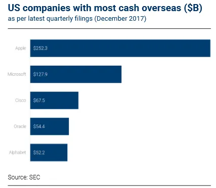 对苹果、甲骨文、微软、谷歌母公司Alphabet等现金充裕的科技公司来说,新税法将使它们可以从海外拿回大量资金。