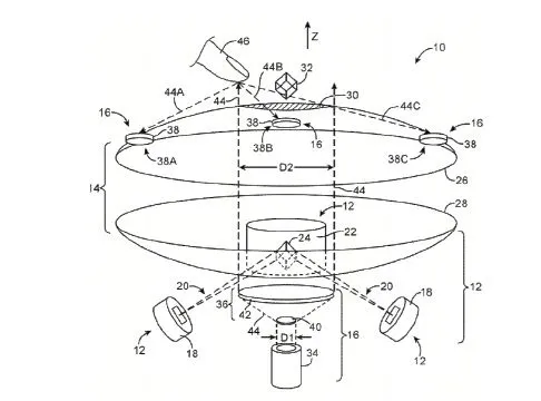 2012年,苹果申请了全息投影专利(如下图所示)。在专利中,它详细描述了这样一种系统:可以将图像投射到半空中,无需任何头戴设备就能看见。这种增强现实形式省去了笨重的头戴设备或眼镜。从近期传闻来看,这一专利说不定会被应用到苹果的下一次用户界面升级中。