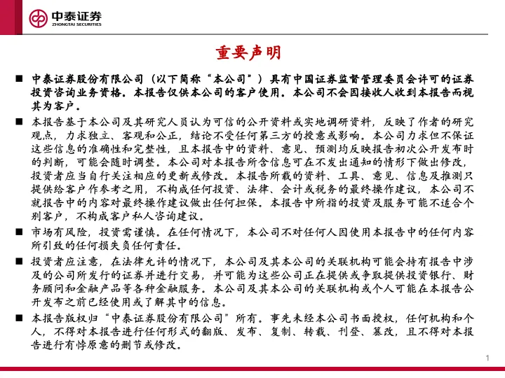 中泰证券及相关内容提供方保留对本订阅号所载内容的一切法律权利,未经书面授权,任何人或机构不得以任何方式修改、转载或者复制本订阅号推送信息。若征得本公司同意进行引用、转发的,需在允许的范围内使用,并注明出处为“中泰证券研究所”,且不得对内容进行任何有悖原意的引用、删节和修改。