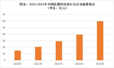 2024年,中国氢燃料电池行业市场规模约59.9亿元。得益于政策支持、技术突破、基础设施完善与市场需求释放的多重驱动。国家层面将氢能纳入战略性新兴产业,《氢能产业发展中长期规划(2021-2035年)》明确发展路径,地方配套财政奖励与应用激励政策降低推广成本,长三角、珠三角等四大产业聚集区形成协同发展效应;膜电极、双极板等核心材料国产化率显著提升,400kW级电堆成功商用,推动系统成本大幅下降至2000元/KW,拓展了重卡、港口物流等应用场景;全国加氢站累计建成超540座,绿氢产量稳步增长,基础设施支撑能力持续增强,同时交通领域商用车推广与工业领域绿氢需求释放,共同为行业规模扩张注入强劲动能。