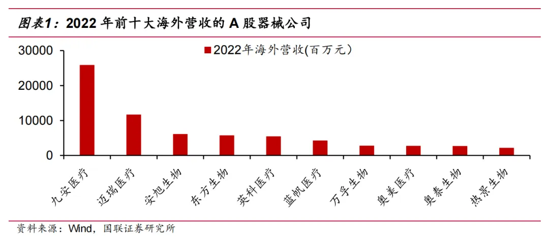 医疗器械由于准入壁垒相对较低、海外临床注册门槛、费用都相对药品有一定优势,因此器械出海具有超过20年的较长时间历史,早期以低值耗材等中低端产品为主,依靠成本优势进入全球。部分具有全球竞争力的企业也可以出口中高度产品,如迈瑞医疗的医疗设备。2022年A股器械公司海外营收为1,093亿元,其中前十大公司占比为64%。