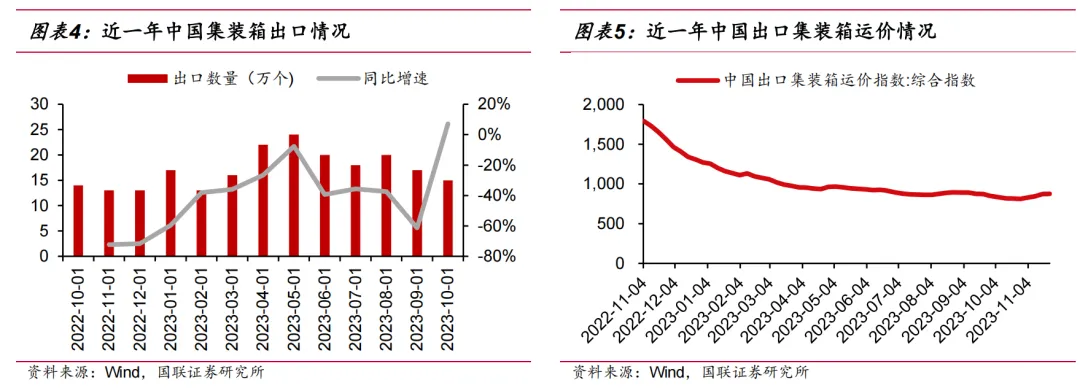国际航运价格下降有望推动医疗器械出海发展。受全球经济复苏缓慢、国际商品持续去库存影响,2022年10月份以来,中国集装箱出口数量持续下滑,2023年10月份迎来拐点,单月集装箱出口数量达15万个,同比实现正增长。同时航运需求逐步下滑,中国出口集装箱运价指数持续下降,从2022年10月的1830点下降至2023年10月的877点。10月后显著看到数据有所回暖,虽然暂未形成趋势。