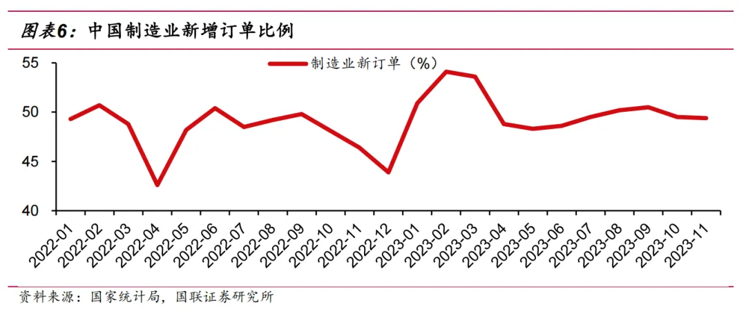 2023年5月份中国制造业新增订单比例达到较低点,为48.3%,随后触底反弹,2023年9-11月份逐步恢复至50%左右,有一定恢复。