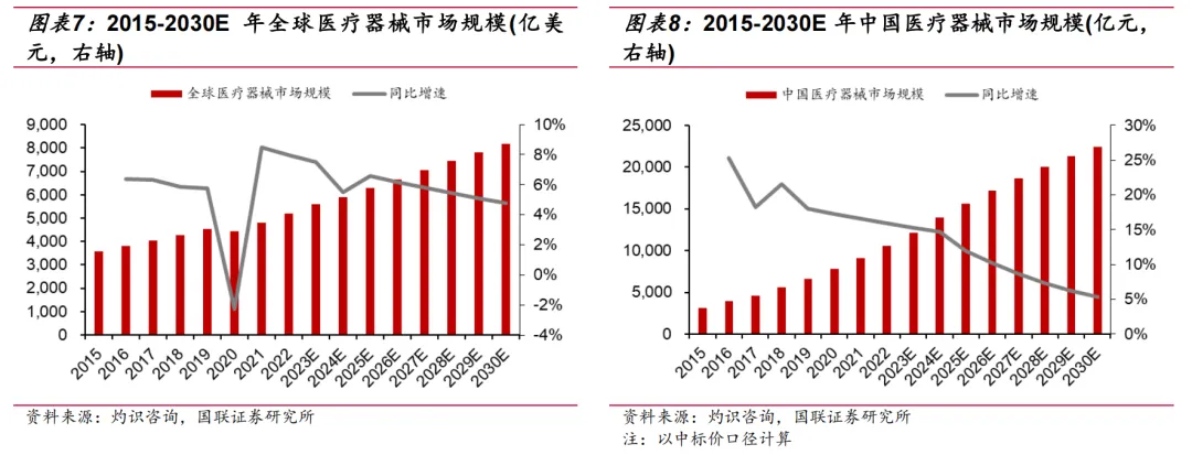 2023年全球医疗器械市场规模约为5,580亿美元,同比增速为7.51%,同期中国医疗器械市场规模为12,137亿元,同比增速达到15.3%,远高于国际增速,但国际市场整体规模为国内3.3倍,由于国内数据以中标价口径计算,折算到出厂价口径,我们预计国内外差距在5-6倍左右。