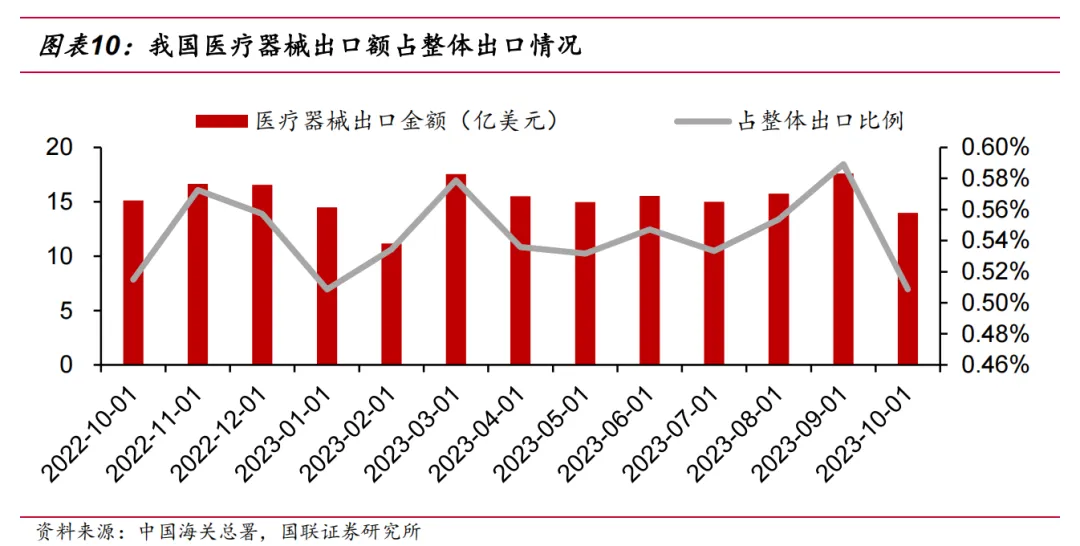 2023年1-10月份中国医疗器械出口金额为151.59亿美元,占整体出口的0.54%,其中9月份医疗器械出口额为17.61亿美元,同比增长5.31%,有一定边际改善趋势。