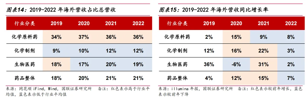 回顾2019-2022年药品行业出海历史,2022年药品行业整体海外营收占比总营收高达21%,其中化学原料药占比高达36%,生物医药占比达19%,化学制剂占比仅12%。