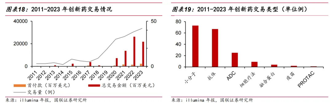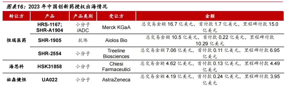(1)产品技术类型更加多样,ADC出海成为主流:授权出海的产品从早年的小分子和单抗类逐步拓展到ADC、多特异性抗体、细胞疗法等新结构类型药物。ADC授权出海成为主导,2022年和2023年ADC的授权出海交易总金额分别为144.7亿美元和93亿美元,分别占全年交易总金额的54.7%和42.4%;