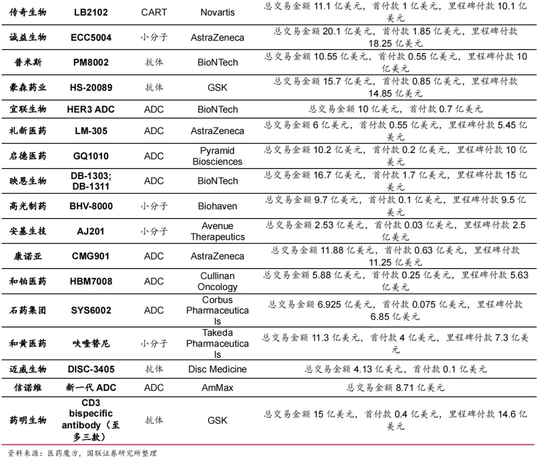b)开发进度和速度靠前。如果靶点和目标适应症具备足够潜力和市场,而且在药物开发进度和速度上靠前,即使尚未在临床数据上充分验证竞争优势,这类创新药可作为拼图填补海外药企在特定疾病领域的产品空缺,因此也能够获得海外药企的认可和买单。这类创新药的授权出海案例包括映恩生物的BD-1303(携载DXd类TOP-1抑制剂毒素的HER2 ADC,授权给BioNTech)和翰森制药的HS-20089(B7H4 ADC,授权给GSK),以及传奇生物的LB-2102(DLL3 CAR-T,授权给诺华)等。