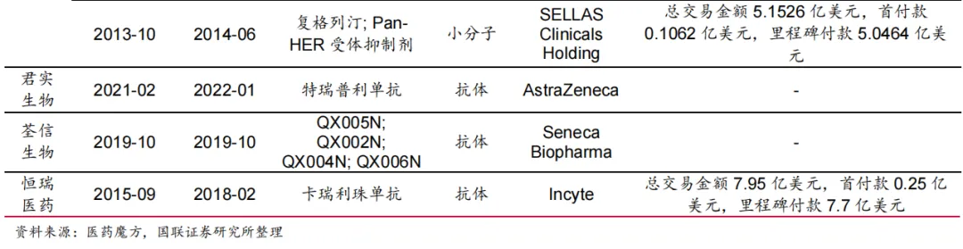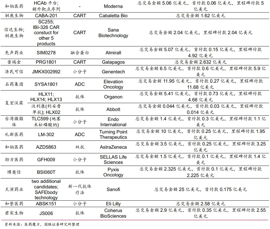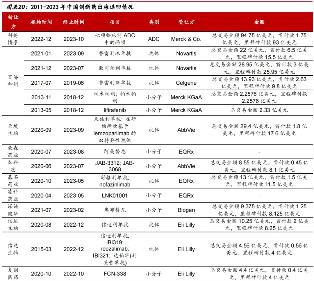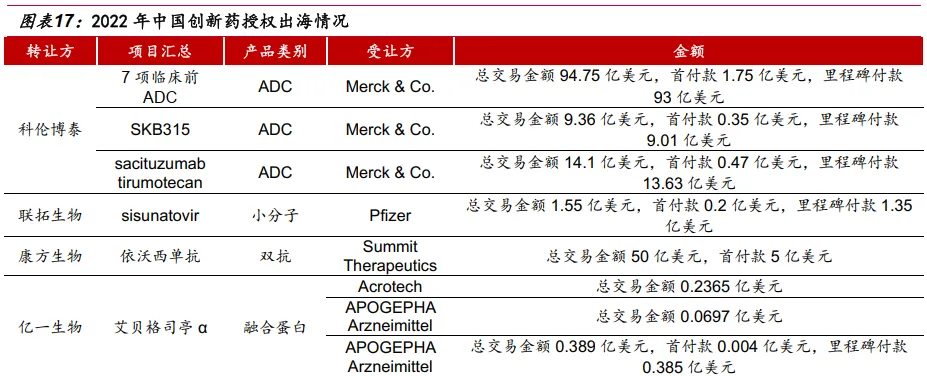 (2)更多类型中国药企作为转让方参与,从Biotech、Biopharma到Big pharma都有相关案例报道,通过对外授权实现短期内资金回笼,对Biotech的融资和已上市公司股价的上涨都有积极作用;