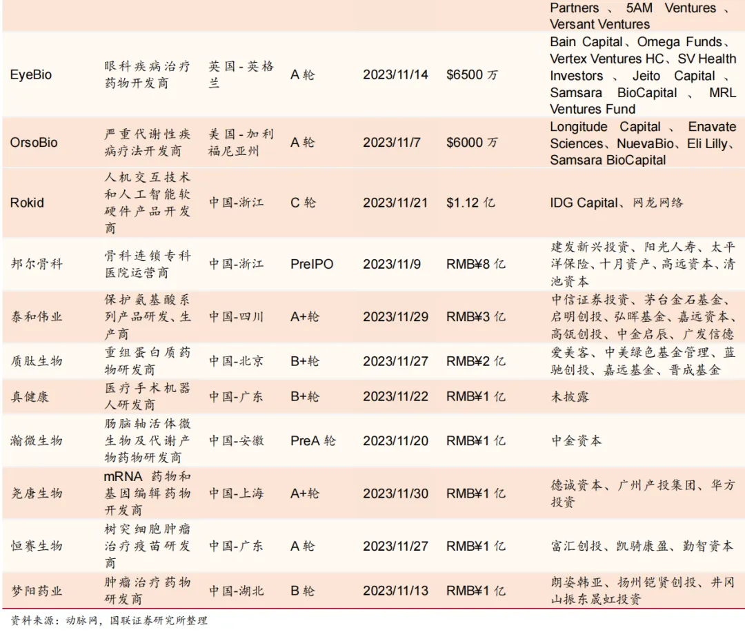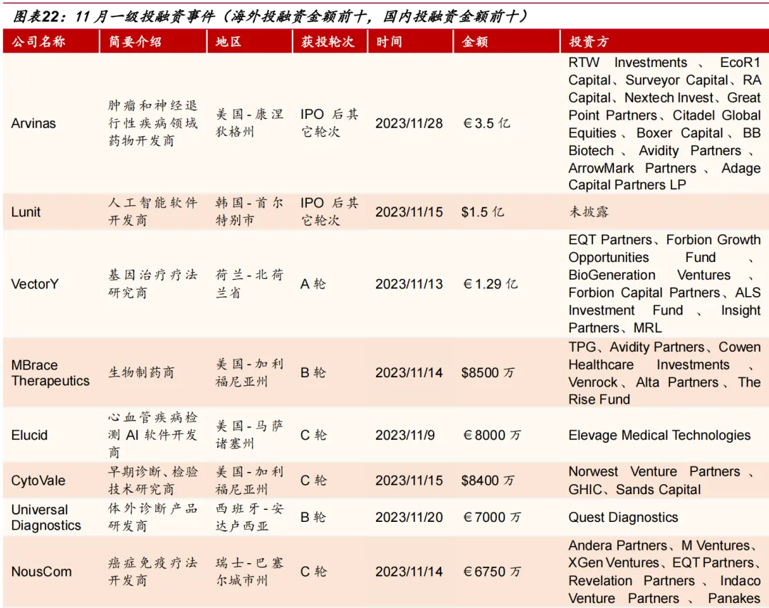本月海外一级投融资主要聚焦于新药研发、数字化医疗、体外诊断器械。国内一级投融资主要聚焦于抗肿瘤新药研发、人工智能医疗设备。