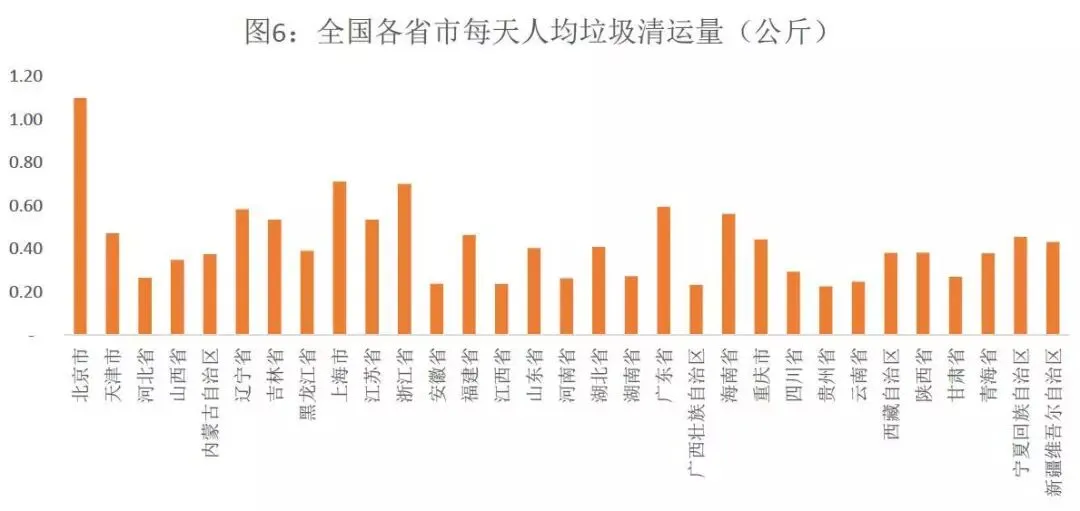 下图为2016年全国各大省市垃圾清运量的数据,可以看出北京市以每日人均清运1.1公斤垃圾领衔全国首位。该数据并不代表北京市居民一定是产生垃圾最多的,因为垃圾清运量与垃圾产生量中间有一定差异,且北京的垃圾清运率在全国应该是比较充分的。