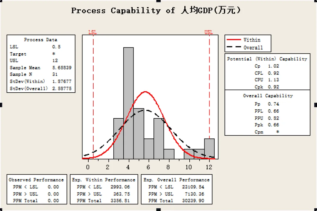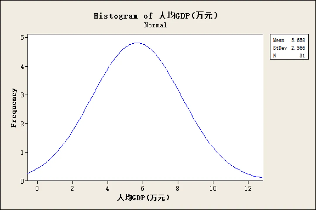 通过对全国各大省市人均GDP直方图及正态分布图进行分析,人均GDP的分布也服从正态分布,大部分省市的年人均GDP位于4-7万元区间,全国省市人均GDP均值为5.66万元。