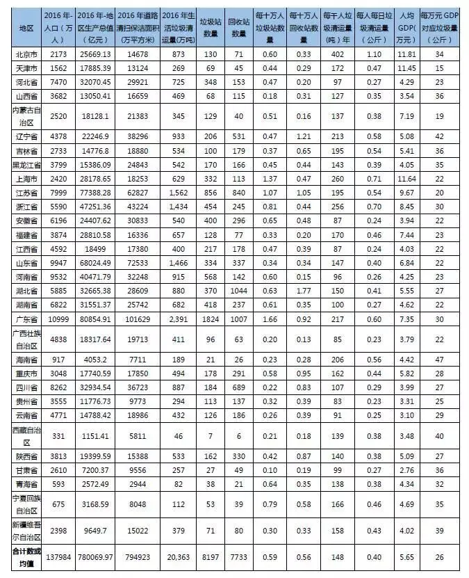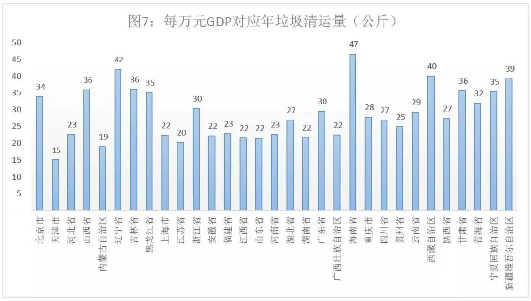从这个角度将,海南、辽宁省每万元GDP对应的年垃圾清运量分别是47、42公斤,居全国前列。天津市每万元GDP对应年垃圾清运量15公斤,不考虑其他因素,单从该数据上看,天津的GDP是最“卫生”的GDP。
