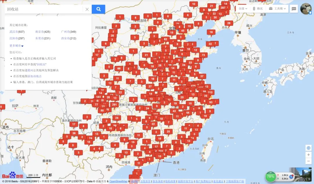 通过百度地图对回收站及垃圾站两个关键词进行搜索,出现如下两张图注1,垃圾站与回收站恐怕是普通居民最不愿意接触的地方之一,但是通过百度地图搜索,作者发现,垃圾站和回收站几乎是人口和经济的标志之一,哪里人口密集和经济发达,哪里的垃圾站和回收站就密集,根据对百度地图数据统计,全国垃圾站数量、回收站数量分别为8197个、7733个,其中北京市垃圾站、回收站数量分别为130个、71个。