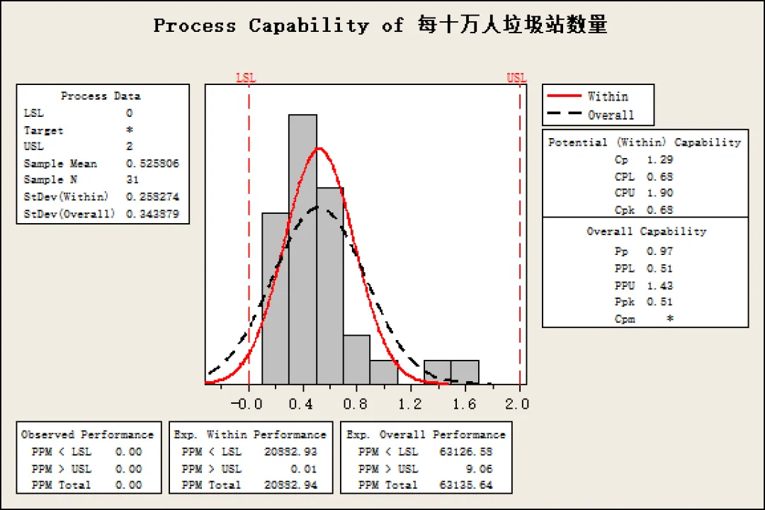 根据对每日垃圾清运量数据的直方图以及正态分布图,可以看出,全国各大省市的每日人均垃圾清运量基本符合正态分布,其中大部分省市的人均每日清运量在0.2-0.6公斤之间,平均值为0.42公斤。