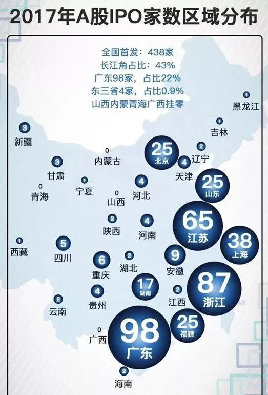 这是2017年赴A股上市的企业数量分布。全国首发438家,长三角占了43%,广东占了22%。