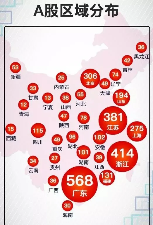 换张图来看,来看A股整体区域分布。格局没变,最强悍的还是广东、浙江、江苏,北京、上海紧随其后。目前A股上市公司3468家,其中广东568家,占16.38%,浙江414家,占11.94%,江苏381家,占10.99%。