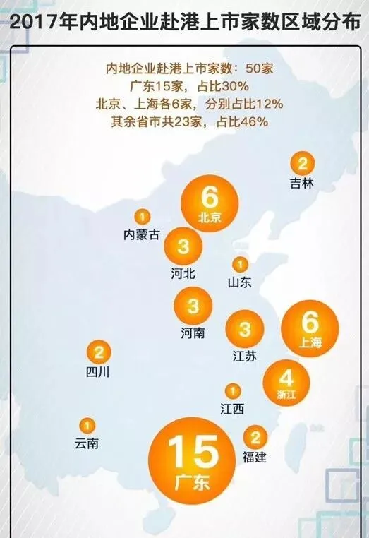 我们看过去一年很热的港股,广东几乎是一枝独秀了。17年港股大热,赴香港上市的内地企业50家,广东独占了15家,占比30%。