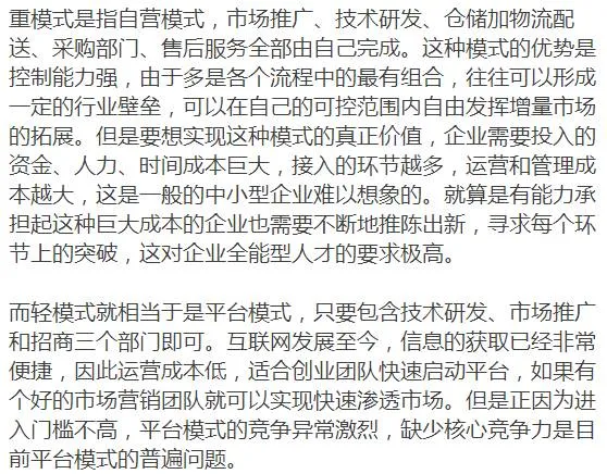 目前的大趋势是轻重模式已经纷纷开始走向融合,模式的选择仅仅是一个企业进入市场的最初选择,随着O2O的发展回归理性,我们看到太多的企业在自己选择的模式上固步自封,苟延残喘。比如在餐饮外卖行业,美团和饿了么的大战并没有闹得两败俱伤,而是让我们看到了两股不断创新进步的力量,它们抛弃绝对的模式束缚,把用户体验和用户需求放在第一位,轻重模式的边界变得模糊,走向融合。