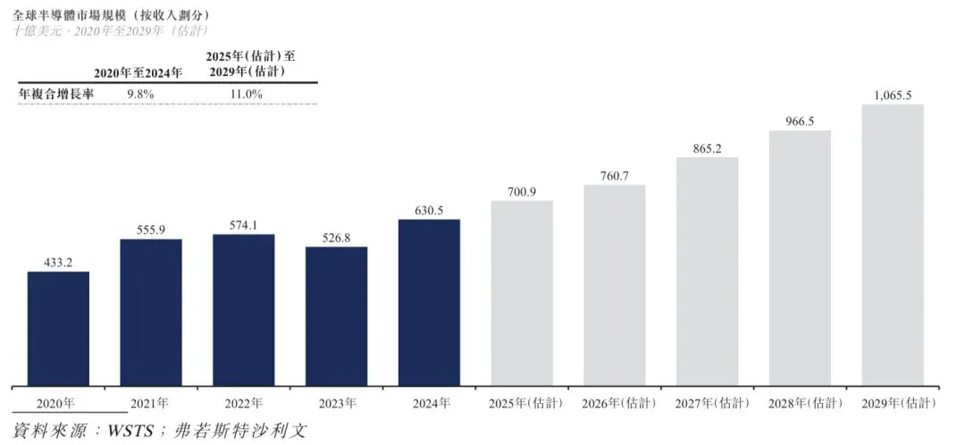 在过去十年,移动互联网的快速发展及智能设备的普及是半导体市场大幅创新和增长的主要动力。尤其是,手机从单纯的通讯工具快速发展为日常生活中必不可少的各式各样功能丰富的设备,推动了先进半导体技术的创新。随着消费电子产品、下一代汽车技术(包括电动汽车、智能汽车和自动驾驶)与智能监控、端侧AI、智能设备、数据中心和服务器、AI芯片、物联网、5G以及基于云的AI解决方案的不断发展,此类衍生及新兴应用预计将在未来十年进一步推动全球半导体行业增长。根据弗若斯特沙利文的资料,全球半导体行业的市场规模由2020年的4,332亿美元增至2024年的6,305亿美元,年复合增长率为9.8%,预计将自2025年起以11.0%的年复合增长率进一步增长,并于2029年达到10,655亿美元。