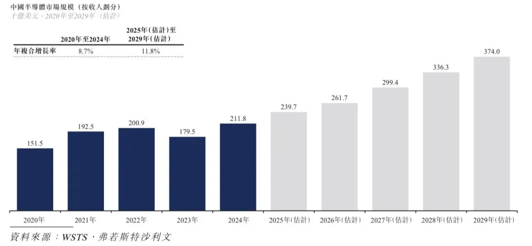 中国已成为消费类电子设备及工业产品的制造中心,并成为这些应用领域的最大市场之一。智能手机、汽车、端侧AI以及AI驱动的数据中心和服务器等终端市场的需求日益增长,进一步推动了该领域的发展。中国半导体行业增速预计将超越全球市场。根据弗若斯特沙利文的资料,中国半导体行业的市场规模由2020年的1,515亿美元增至2024年的2,118亿美元,年复合增长率为8.7%,预计将自2025年起以11.8%的年复合增长率进一步增长,并于2029年达到3,740亿美元。