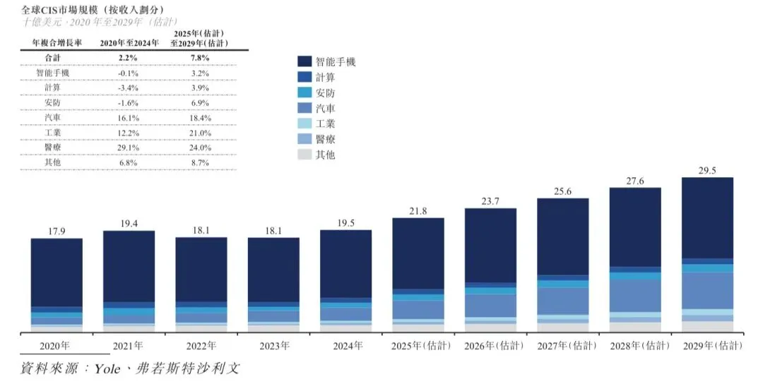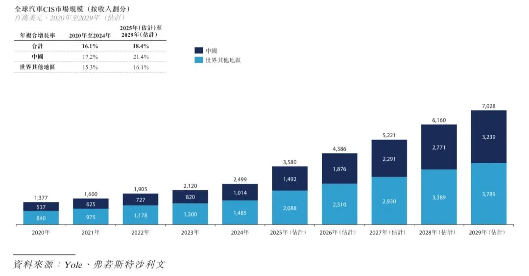 根据弗若斯特沙利文的资料,全球汽车CIS市场由2020年的1,377百万美元增至2024年的2,499百万美元,年复合增长率为16.1%,且预计自2025年起的年复合增长率为18.4%,并于2029年达到7,028百万美元。下图载列全球汽车CIS市场规模。