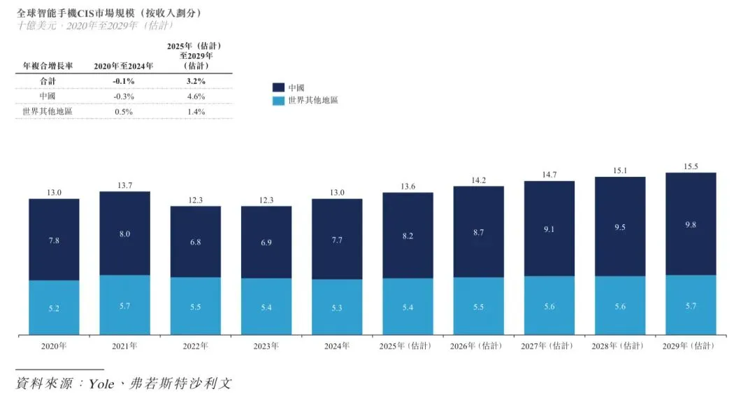 根据弗若斯特沙利文的资料,2024年,智能手机是全球CIS市场中最大的应用领域,占据65%以上的市场份额。全球智能手机CIS市场2020年及2024年分别为130亿美元和130亿美元,维持稳定,在5G普及、多摄像头设备普及、对更好的图像质量、更多样化的成像特性和创新功能的追求的推动下,全球智能手机CIS市场预计将自2025年起以3.2%的年复合增长率扩大,并于2029年达到155亿美元。下图载列全球智能手机CIS市场规模。
