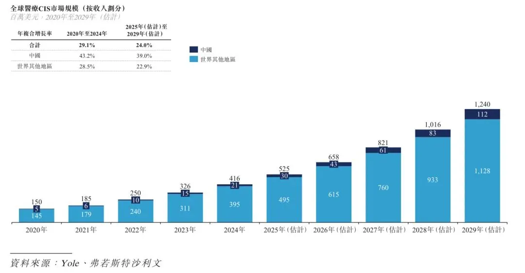 根据弗若斯特沙利文的资料,全球医疗CIS市场由2020年的150百万美元增至2024年的416百万美元,年复合增长率为29.1%,且预计2029年将达到1,240百万美元,自2025年起年复合增长率为24.0%。下图载列全球医疗CIS市场规模。