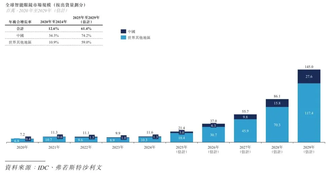 根据弗若斯特沙利文的资料,全球智能眼镜设备市场的出货量由2020年的7百万台增至2024年的12百万台,年复合增长率为12.6%,且预计2029年将达到145百万台,2025年至2029年的年复合增长率为61.4%。