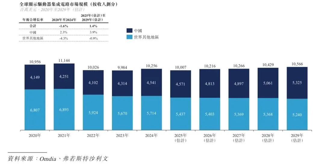 根据弗若斯特沙利文的资料,全球DDIC市场预计由2025年的10,007百万美元增至2029年的10,566百万美元,年复合增长率为1.4%。下图载列全球DDIC市场规模。