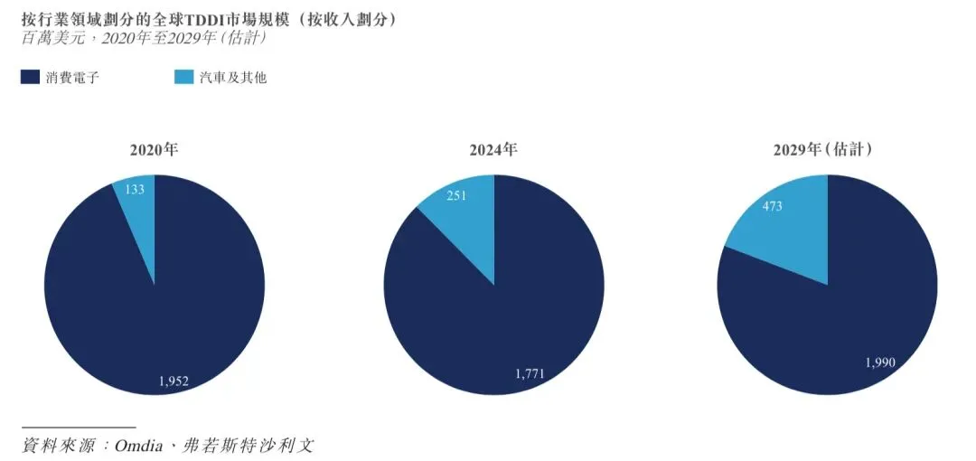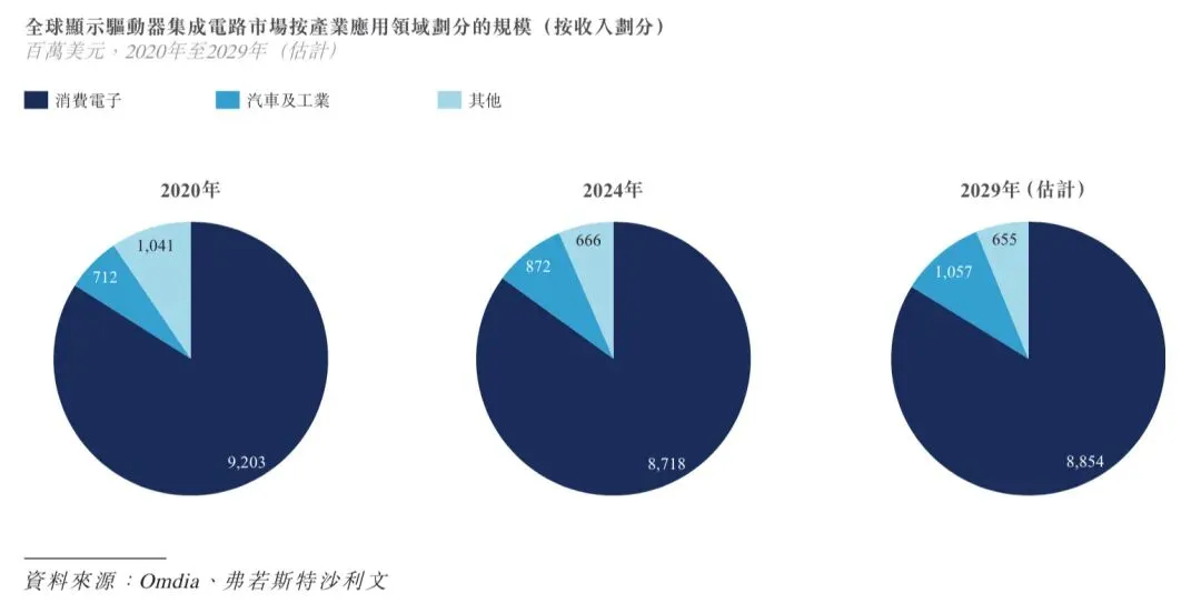 与LCD相比,OLED显示屏的每个像素都能自主发光,因此无需单独的背光。因此,OLED显示屏提供更佳的图像质量,功耗更低,并支持超薄、可折叠和透明设计,且耐用性更佳。随着OLED显示屏的日渐普及,OLED DDIC市场的增长速度预计将赶超整体DDIC市场。根据弗若斯特沙利文的资料,OLED DDIC市场规模由2020年的2,225百万美元增至2024年的4,941百万美元,年复合增长率为22.1%,预计将以5.9%的年复合增长率进一步增长,并于2029年达到6,585百万美元。
