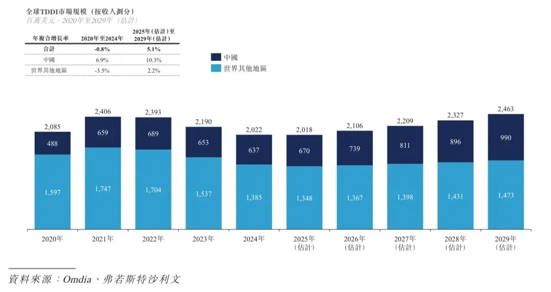 TDDI技术已成为广泛应用的解决方案。TDDI技术因实现更高的屏占比和更薄的设计,在智能手机领域的应用尤为显著。平板计算机、计算机及汽车显示屏等大型显示屏亦正逐步采用TDDI技术。根据弗若斯特沙利文的资料,全球TDDI市场预计将由2025年的2,018百万美元增至2029年的2,463百万美元,年复合增长率为5.1%。下图载列全球TDDI市场规模。