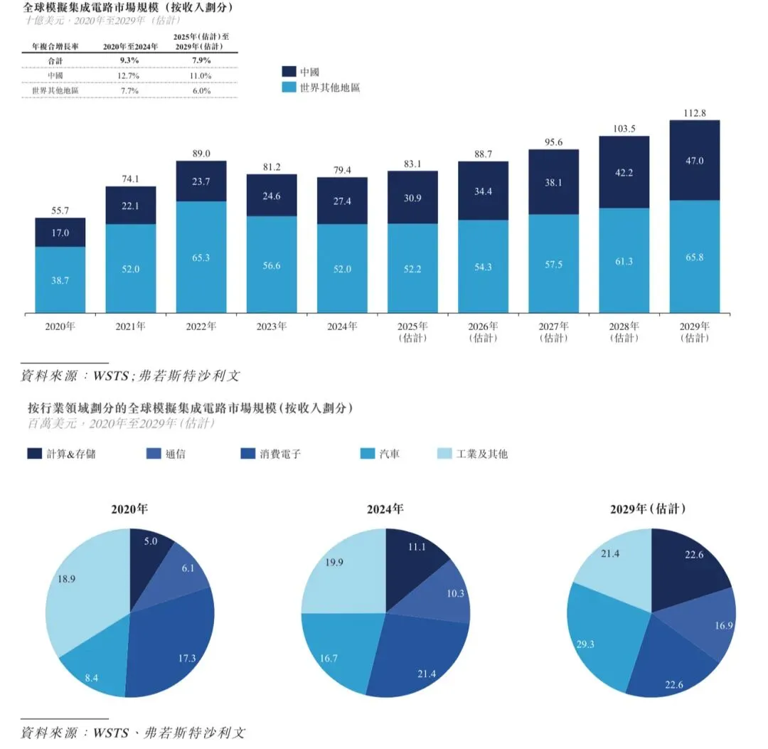 根据弗若斯特沙利文的资料,全球模拟集成电路市场(不含分立半导体市场)由2020年的557亿美元增至2024年的794亿美元,年复合增长率为9.3%,预计2025年至2029年将以7.9%的年复合增长率进一步扩大,并于2029年达到1,128亿美元。下图载列全球模拟集成电路市场规模。