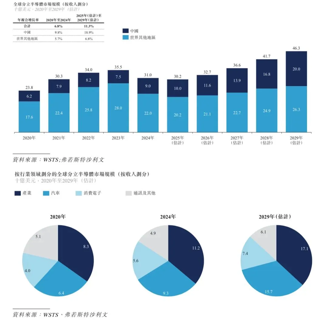 根据弗若斯特沙利文的资料,全球分立半导体市场由2020年的238亿美元增至2024年的310亿美元,年复合增长率为6.8%,预计将由2025年起以11.3%的年复合增长率进一步扩大,并于2029年达到463亿美元。下图载列全球分立半导体市场规模。