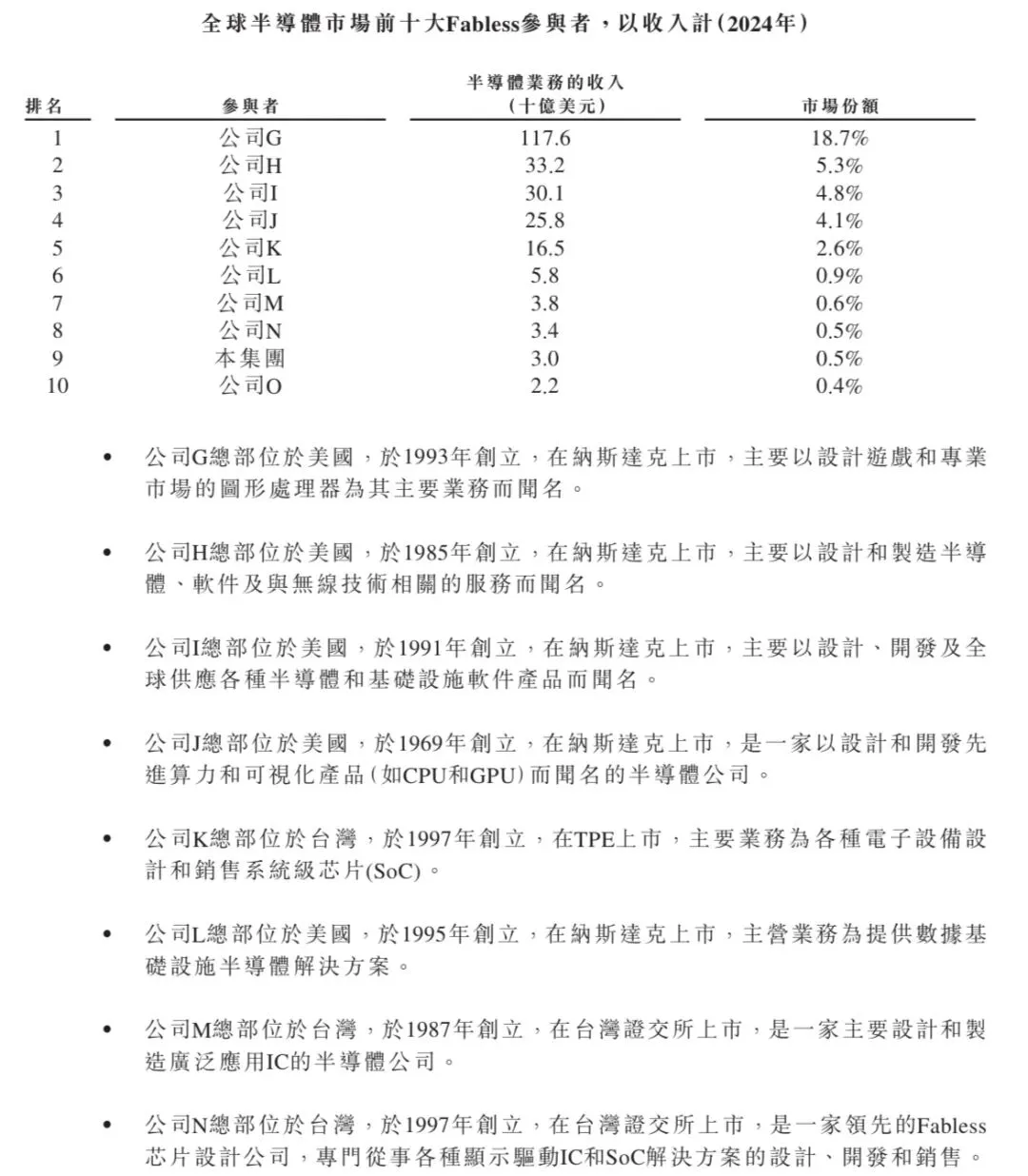 2024年,全球参与半导体设计的半导体公司总数超过5,000家。Fabless模式在全球半导体市场的竞争格局如下表所示。