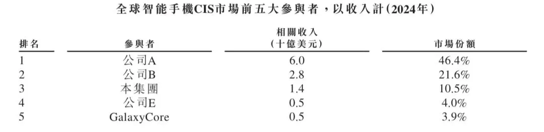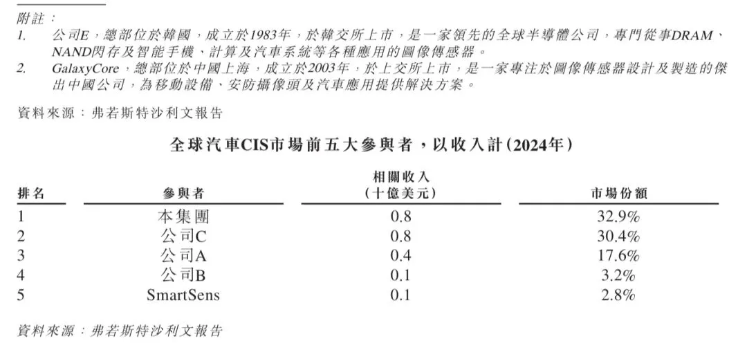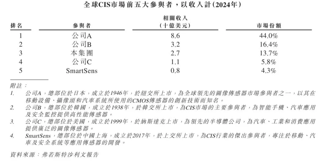 2024年,全球市场上有30多家CIS供应商。根据弗若斯特沙利文的资料,全球CIS市场高度集中,按收入划分,2024年前五大参与者的市场份额合计为84.1%。于2019年至2024年期间,豪威集团一直稳居全球CIS市场前三名,2024年的市场份额达到13.7%。根据弗若斯特沙利文的资料,按2024年收入计,豪威集团是全球第三大CIS供应商和中国最大的CIS供应商及全球最大的汽车CIS供应商。以下排名表中豪威集团的收入不包含在相关市场中纯产品分销所产生的收入。全球CIS市场的竞争格局如下表所示。