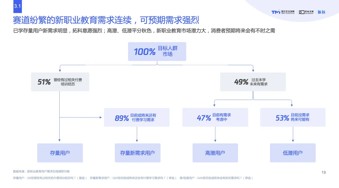 另一方面,非学历职业教育市场潜力巨大,细分赛道丰富多样,具有强烈的可预期需求。腾讯营销洞察(TMI)联合黑板洞察、脉脉数据研究院推出的《数字化时代的新职业教育行业洞察》相关统计数据显示,已学存量用户新需求明显,拓科意愿强烈;高潜、低潜平分秋色,新职业教育市场潜力大,消费者预期将来会有不时之需。