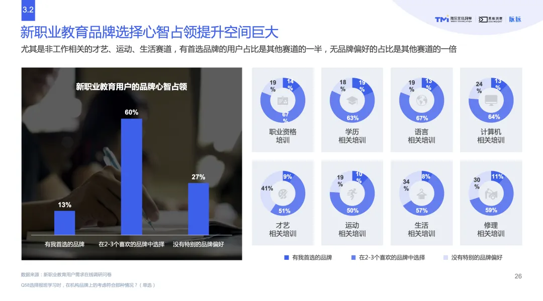 简单来说,心智占领就是强化消费者对某一产品或服务的认知认同程度、把握消费者心智规律并促使其转化为购买动机。相关调查结果表明,加速高潜用户决策的关键在于品牌心智的形成。新职业教育品牌选择心智占领提升空间巨大,尤其是非工作相关的才艺、运动、生活赛道,有首选品牌的用户占比是其他赛道的一半,而无品牌偏好的占比是其它赛道的一倍。