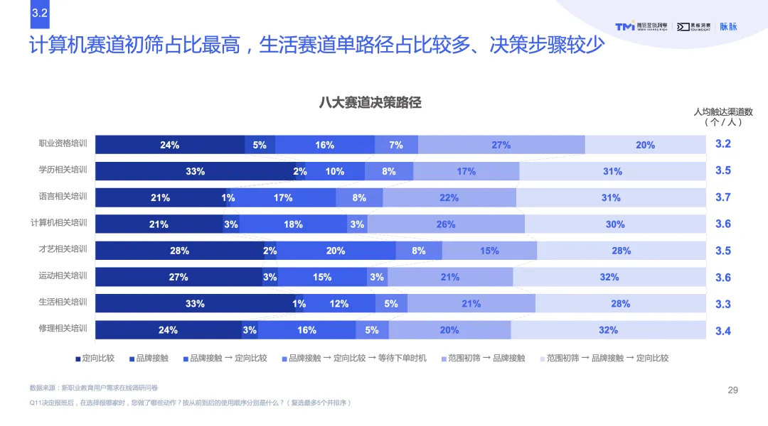 其中,计算机赛道初筛占比最高,生活赛道单路径占比较多、决策步骤较少,非工作相关赛道品牌心智占领成功难度更大。也就是说,生活、运动、才艺赛道的决策路径相对简单,品牌和用户的接触机会更少,品牌教育的次数也少,品牌成功占领用户心智难度更大,而职业资格类培训刚需强,付费意愿更强,业务规模潜力更大。